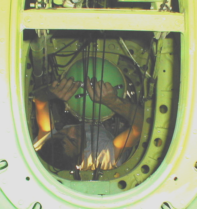 Inside fuselage, putting in oxygen tank. Too tight for me.